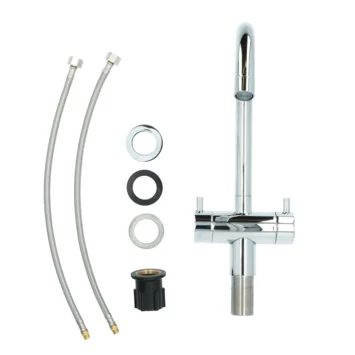 De Atlantic keukenkraan Adrian 2-knops Chroom bestaat uit een verchroomde keukenkraan van 33,5 cm hoog met 2 flexibele aansluitslangen, bevestigingsmateriaal en montagehandleiding. De Adrian keukenkraan heeft een draaibare uitloop van 360° waarmee je eenvoudig plaats maakt bij je gootsteen. Met de 2 draaiknoppen kies je hoeveel warm of koud water je wil gebruiken. Aan de anti-kalk perlator hecht kalk zich moeilijk vast en veeg je er makkelijk met de hand af. Deze modern vormgegeven kraan heeft een glanzende chromen afwerking. Gebruik alleen water en een zachte doek om de kraan schoon te maken. Gebruik geen schurend, bijtend, azijnhoudend of agressief schoonmaakmiddel. Op de kraan heb je 5 jaar garantie.