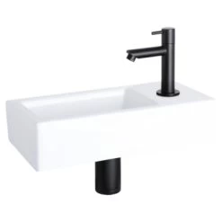 De Differnz Fonteinset Ravo Rechts wit keramiek past met zijn strak witte bak en zwarte accessoires perfect in een trendy toilet. De sifon en afvoerplug zijn net als de kraan zwart afgewerkt, waardoor een mooi geheel ontstaat. De kraan, de afvoerplug en de sifon zijn meegeleverd. De fontein zelf is gemaakt van keramiek en 38,5×18,5x9cm groot.