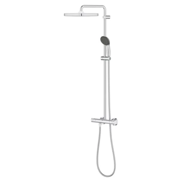 Met het Grohe Vitalio Start douchesysteem ga je voor een douchesysteem met geweldige functies en een royalere dekking voor een eenvoudige upgrade van je huidige badkamer. Dit GROHE Vitalio Start 250 Cube thermostatische douchesysteem biedt je dit allemaal, plus alle voordelen qua gemak en comfort van een thermostaat. Dit opbouwsysteem om aan de wand te monteren bestaat uit een Vitalio Comfort 250 Cube hoofddouche, een Vitalio Start 100 handdouche, thermostaat, douchestang met 390mm zwenkbare douchearm en glij-element om de handdouche te verstellen, plus een 1750mm VitalioFlex Comfort Twistfree doucheslang. De hoofddouche van 250mm biedt een zachte, ontspannende Rain Spray. De 100mm handdouche wordt geleverd met een ShockProof siliconen ring om hem te beschermen tegen vallen of stoten. GROHE DreamSpray zorgt ervoor dat de straal uit elk sproeigaatje precies goed is waardoor je douche-ervaring nog meer comfort en plezier biedt. De SpeedClean-sproeigaatjes zijn ontworpen om kalk er makkelijk vanaf te vegen. Het douchesysteem levert water met een constante temperatuur zodat je nooit voor onaangename verrassingen komt te staan dankzij GROHE’s TurboStat-technologie. Om je te beschermen tegen verbranding is de GROHE SafeStop temperatuurbegrenzer ingesteld op 38°C. Hiermee wordt er voorkomen dat met name kinderen de watertemperatuur per ongeluk te hoog zetten. En de GROHE SafeStop Plus-temperatuurbegrenzer kan worden ingesteld op 43°C voor extra veiligheid. Schakel tussen hoofd- en handdouche en regel het volume, allemaal via één handgreep dankzij de AquaDimmer-functie. De duurzame maar oogverblindende GROHE StarLight chroomn afwerking zorgt ervoor dat het douchesysteem er jarenlang onberispelijk uit blijft zien.