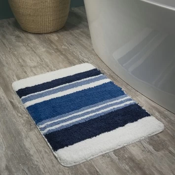 De Sealskin Badmat Soffice Blauw 60×90 cm is gemaakt van sterke microfibers en wordt gekenmerkt door een klassiek lijnenpatroon in diverse warme kleuren.