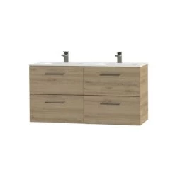 Door het strakke en tijdloze design past dit Tiger Studio badkamermeubel in iedere badkamer. Deze wastafelonderkast heeft 2 ruime lades om alle badkamerspullen overzichtelijk in op te bergen. De lades zijn uitgerust met hoogwaardige ‘soft close’ geleiders waardoor ze geruisloos sluiten. De warme houttint geeft een sfeervol karakter aan het meubel. Daarnaast krijgt het meubel, door de voelbare houtnerf, een mooie natuurlijke uitstraling. De mooie, wit matte polybeton wastafel met ovale waskommen en rvs grepen maken deze set compleet.