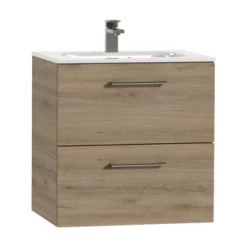 Door het strakke en tijdloze design past dit Tiger Studio badkamermeubel in iedere badkamer. Deze wastafelonderkast heeft 2 ruime lades om alle badkamerspullen overzichtelijk in op te bergen. De lades zijn uitgerust met hoogwaardige ‘soft close’ geleiders waardoor ze geruisloos sluiten. De warme houttint geeft een sfeervol karakter aan het meubel. Daarnaast krijgt het meubel, door de voelbare houtnerf, een mooie natuurlijke uitstraling. De mooie, wit glanzende polybeton wastafel met ovale waskom en rvs grepen maken deze set compleet.