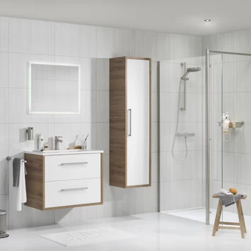 Een nette kolomkast in hoogglans wit gecombineerd met eiken, dat is Tiger kolomkast Boston 40cm eik inox greep. Deze kast is eenvoudig aan de wand te bevestigen of op de grond te plaatsen met de los verkrijgbare poten. De kast heeft 5 legplanken, zodat je al jouw badkamerspullen netjes kunt opbergen. De deur van de kast sluit geluidloos door middel van het soft-close-systeem, waardoor deze nooit dicht kan klappen. De greep is gemaakt van inox, beter bekend als rvs, en daarom corrosiebestendig. Wil je deze kast in een andere kleur of maat? Dat kan, want GAMMA heeft kolomkast Boston ook in verschillende kleuren en maten in zijn assortiment. Kortom: een stevige, ruime en moderne kolomkast voor in je badkamer.