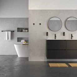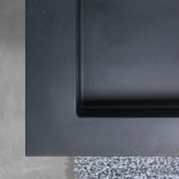 Daarnaast bestaat deze set uit twee matzwarte polybeton wastafels met natuursteen look. Tijdens het ontwerpproces van de waskommen is goed nagedacht over een juiste balans tussen design en functionaliteit. Polybeton wastafels zijn hygiënisch en gemakkelijk in onderhoud. De wastafel heeft twee externe overlopen en 2 kraangaten. Voor het overloopgat wordt een sierring in zowel chroom als zwart meegeleverd waardoor deze altijd mooi aansluit bij je badkameraccessoires.