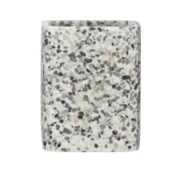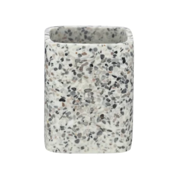 De Terrazzo tandenborstelbeker creëert met zijn patroon in wit, beige en grijze accenten een trendy en decoratieve sfeer aan jouw badkamer. De Terrazzo badkamercollectie is gemaakt van Polyresin; een mix van gemalen natuursteen wat wordt vermengd met een vloeibare kunsthars. De tandenborstelbeker is daardoor zo hard als steen, vochtbestendig en kleurecht. Dit maakt het gebruik ervan in de badkamer ideaal. De Terrazzo serie heeft meer accessoires voor jouw badkamer en toilet in een terrazzo tegellook.
